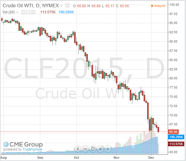 Стоимость январских фьючерсов на американскую легкую нефть марки WTI (Light Sweet Crude Oil) упала до $65,56 за баррель на Нью-Йоркской товарной бирже.