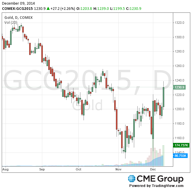 Стоимость февральского фьючерса на золото на COMEX сегодня выросла до 1239.0 долларов за унцию.