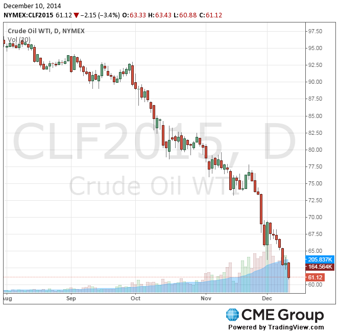 Стоимость январских фьючерсов на американскую легкую нефть марки WTI (Light Sweet Crude Oil) упала до 60,63 доллара за баррель на Нью-Йоркской товарной бирже.