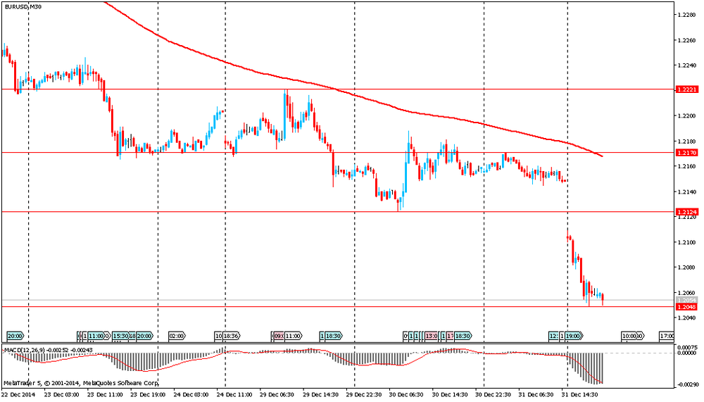 Евро упал к двухлетнему минимуму в ожидании того, что Европейский центральный банк, заседание которого состоится 22 января, запустит программу покупок государственных облигаций. На текущий момент инфляция в еврозоне находится ниже целевого значения ЦБ в 2%, чему способствует понижение стоимости нефти на мировом рынке. По этой причине более 90% опрошенных Bloomberg экономистов прогнозировали в декабре, что ЕЦБ запустит монетарные стимулы.