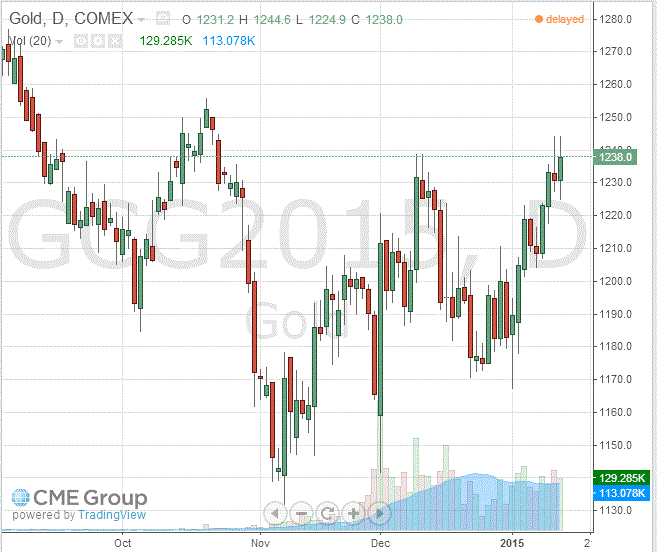 Стоимость февральского фьючерса на золото на COMEX сегодня выросла до 1238.00 долларов за унцию.