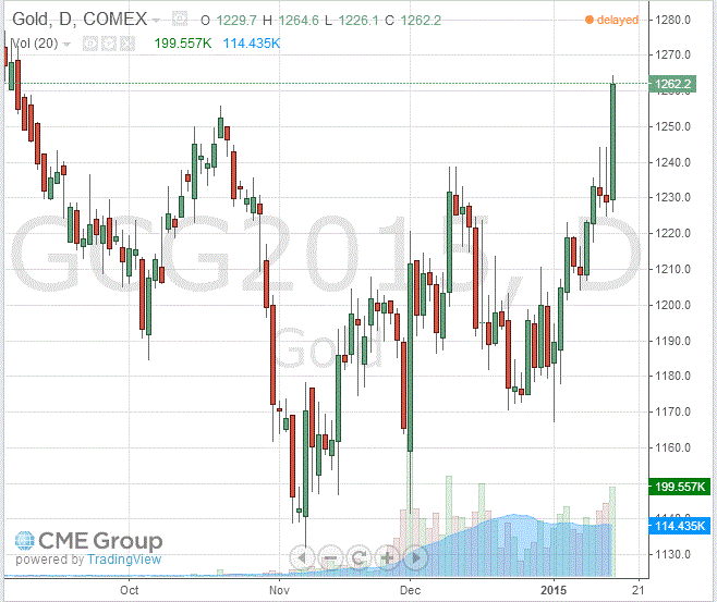 Цены на золото выросли сегодня более чем на два процента, достигнув при этом 4-месячного максимума, что было связано с неожиданным решением Швейцарского ЦБ отказаться от привязки курса франка. Помимо этого, ШНБ понизил ставку по депозитам до востребования до -0,75%.