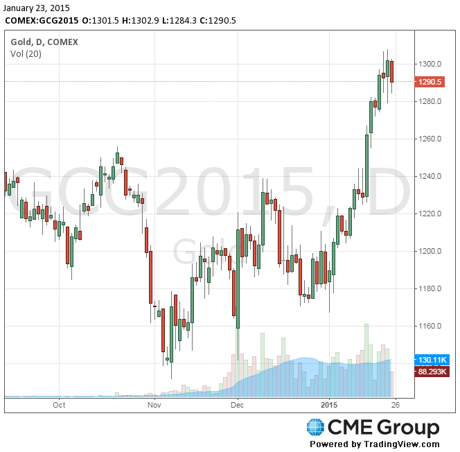 Цены на золото снижаются с пятимесячного максимума на фоне укрепления доллара после объявления программы количественного смягчения Европейским центробанком.