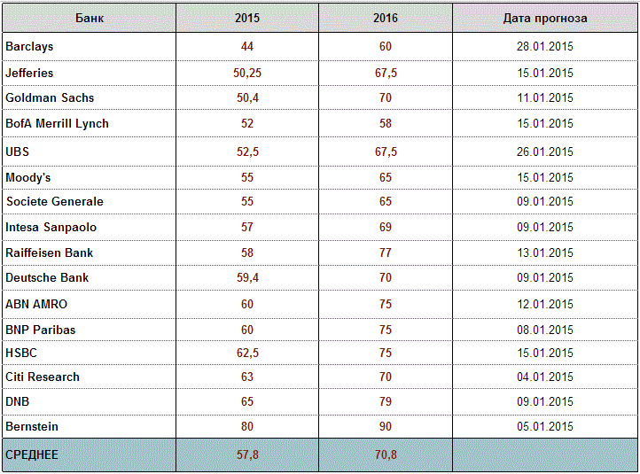 В целом, ряд банков ожидает такие цены на нефть для 2015-2016 года: