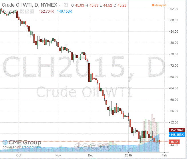 Стоимость мартовских фьючерсов на американскую легкую нефть марки WTI (Light Sweet Crude Oil) упала до 45,33 доллара за баррель на Нью-Йоркской товарной бирже.
