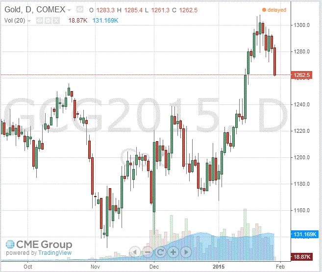 Стоимость февральского фьючерса на золото на COMEX сегодня снизилась до 1262.50 долларов за унцию.