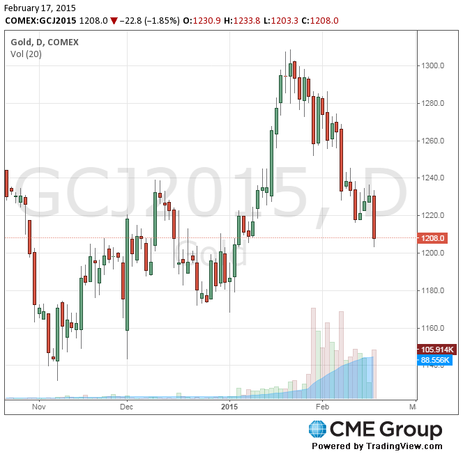 Стоимость апрельского фьючерса на золото на COMEX сегодня упала до 1203.30 долларов за унцию.