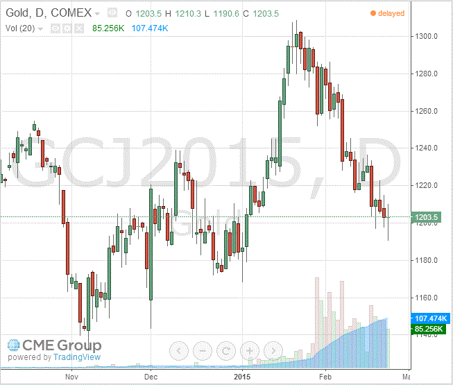 Цены на золото заметно выросли, отступив при этом от семинедельного минимума, и закрепившись выше отметки $1200. Поддержку драгметаллу оказали разочаровывающие данные США, а также падение американских фондовых индексов. Национальная ассоциация риэлторов (NAR) сообщила, что продажи на вторичном рынке жилья в январе упали, подчеркнув неравномерное восстановление рынка жилья, которое проявляется почти шесть лет после конца рецессии. Согласно данным, продажи жилья на вторичном рынке упали на 4,9% в прошлом месяце с декабря и достигли сезонно скорректированных темпов 4,82 млн, заявила она в понедельник. Это самые медленные темпы за девять месяцев. Экономисты ожидали, что в январе продажи снизятся до уровня 5,03 млн. Продажи за декабрь были пересмотрены до 5,07 млн. с 5,04 млн. Продажи в январе выросли на 3,2% по сравнению с 2014 годом. С учетом текущих темпов продаж, это займет 4,7 месяца, чтобы исчерпать запас домов на рынке. Медианная цена продажи дома на вторичном рынке была на 6,2% больше по сравнению с годом ранее, на уровне $199600 в январе.