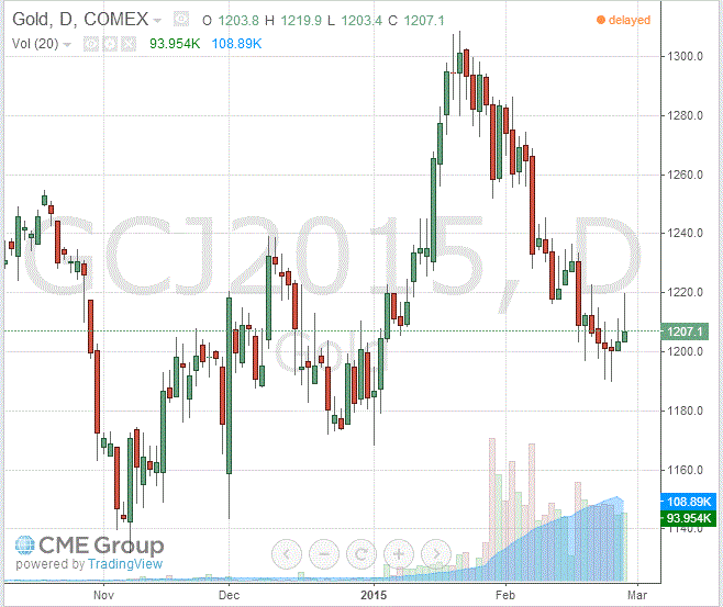 Стоимость апрельского фьючерса на золото на COMEX сегодня выросла до 1207.10 долларов за унцию.