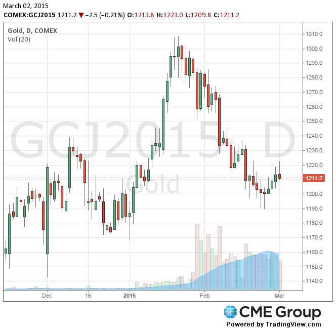 Стоимость апрельского фьючерса на золото на COMEX сегодня выросла до 1223.00 долларов за унцию и затем упала до 1209.80 долларов за унцию.