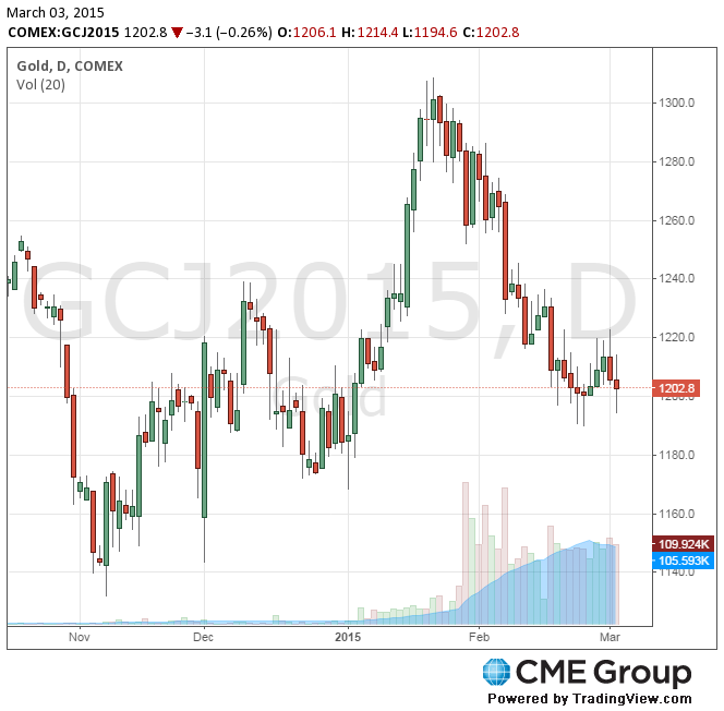 Стоимость апрельского фьючерса на золото на COMEX сегодня упала до 1194.60 долларов за унцию.