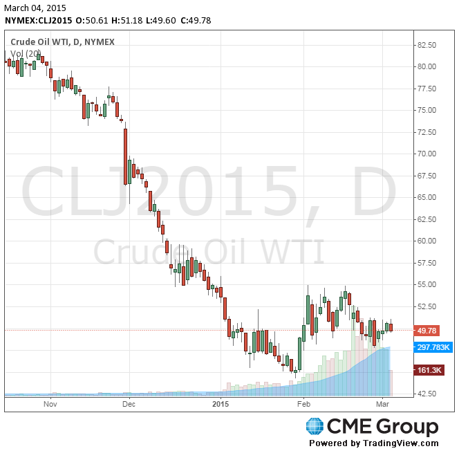 Стоимость апрельских фьючерсов на американскую легкую нефть марки WTI (Light Sweet Crude Oil) упала до 49,60 доллара за баррель на Нью-Йоркской товарной бирже.