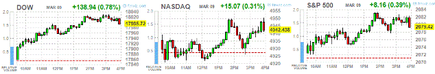 Ключевые фондовые индикаторы США завершили торги с повышением после резко спада в пятницу. Внимание инвесторов по-прежнему сосредоточено на планах ФРС США относительно сроков повышения учетной ставки. Они опасаются того, что она может быть повышена раньше, чем этого многие ожидают. Данная обеспокоенность усилилась после того, как данные показали, что уровень безработицы снизился в феврале до минимума с июня 2008 года - 5,5% с 5,7% в январе. Число рабочих мест в несельскохозяйственных отраслях экономики подскочило на 295 тысяч. Аналитики ожидали снижения безработицы до 5,6% и роста числа рабочих мест на 241 тысяч.