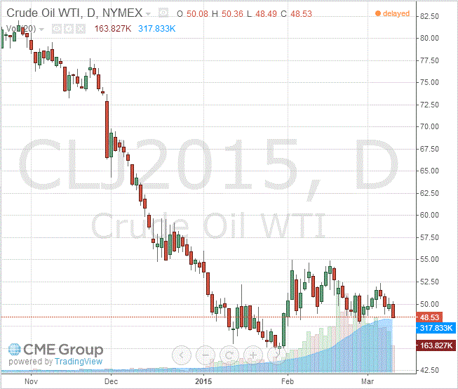 Стоимость апрельских фьючерсов на американскую легкую нефть марки WTI (Light Sweet Crude Oil) упала до 48,53 доллара за баррель на Нью-Йоркской товарной бирже.