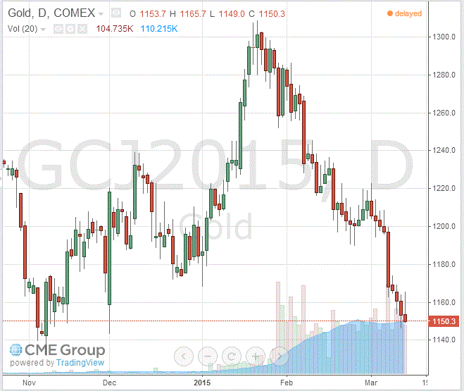 Стоимость апрельского фьючерса на золото на COMEX сегодня снизилась до 1150.30 долларов за унцию.