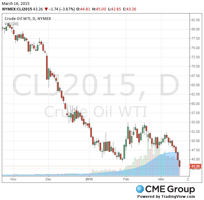 Стоимость апрельских фьючерсов на американскую легкую нефть марки WTI (Light Sweet Crude Oil) упала до 42,85 доллара за баррель на Нью-Йоркской товарной бирже.