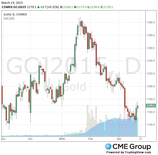 Цены на золото растут с двухнедельного максимума, достигнутого после того, как ФРС понизила прогнозы для американской экономики и намекнула на неторопливое повышение процентных ставок.