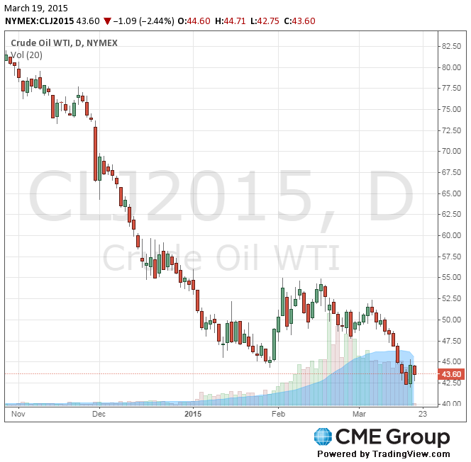 Стоимость апрельских фьючерсов на американскую легкую нефть марки WTI (Light Sweet Crude Oil) упала до 42,75 доллара за баррель на Нью-Йоркской товарной бирже.