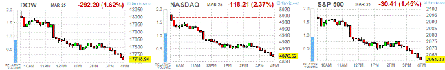 Фондовые индексы США снизились в среду. Индексы реагировали на изменения на валютных рынках и на публикацию данных по заказам на товары длительного пользования, которые неожиданно снизились в прошлом месяце. Падение заказов на товары длительного толкнуло доллар США вниз, оказывая, таким образом, первоначальную поддержку акциям. Тем не менее, фондовые индексы торгуются вблизи рекордных максимумов, и слабые экономические данные не приветствуется инвесторами. Спрос на дорогостоящие промышленные товары сократился в прошлом месяце, это признак, что американские компании по-прежнему осторожны в своих расходах на фоне слабого мирового спроса. Заказы на товары длительного пользования - такие товары, как газонокосилки и стиральные машины, предназначенные для использования не менее трех лет - сократились с учетом сезонных колебаний на 1,4% в феврале по сравнению с месяцем ранее, сообщило Министерство торговли. За исключением волатильного транспортного сектора, заказы упали на 0,4%, отметив снижение пятый месяц подряд. Ожидалось, что общие заказы вырастут на 0,2%.