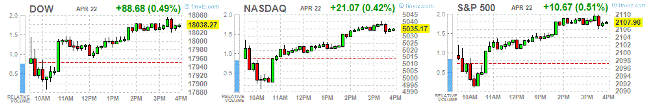 Фондовые индексы США закрылись выше нуля на фоне корпоративной отчетности и новостей. Так, акции McDonald's выросли на 3%, так как компания заявила, что работает над планом по повышению продаж и прибыли, в то время как Coca-Cola прибавила около 1% после публикации квартального отчета.