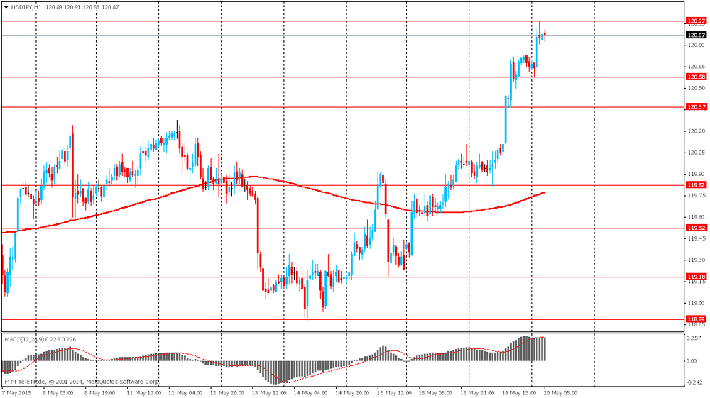 Иена упала по отношению к доллару США после публикации данных по ВВП Японии. Согласно представленным данным правительства, ВВП Японии в первые три месяца этого года вырос на 2,4% в годовом исчислении, что намного превысило рост на 1,1% в четвертом квартале 2014 года. Экономисты прогнозировали рост ВВП на 1,5% в первом квартале 2015 года. В годовом исчислении показатель увеличился на 0,6% по сравнению с последним кварталом ушедшего года. Более внимательное изучение данных дает понять, что увеличение товарно-материальных запасов было движущим фактором роста экономики. Банк Японии надеялся на ускорение роста потребления, но оно выросло лишь на 0,4%, как и в предыдущем квартале. Вклад экспорта в рост ВВП составил -0,2% по сравнению с +0,3%, что является тревожным знаком для Банка Японии, так как он рассчитывает на некоторую помощь со стороны внешнего спроса в деле достижения прогнозируемого среднего роста ВВП на 2,0% в финансовом году, который начался в апреле.