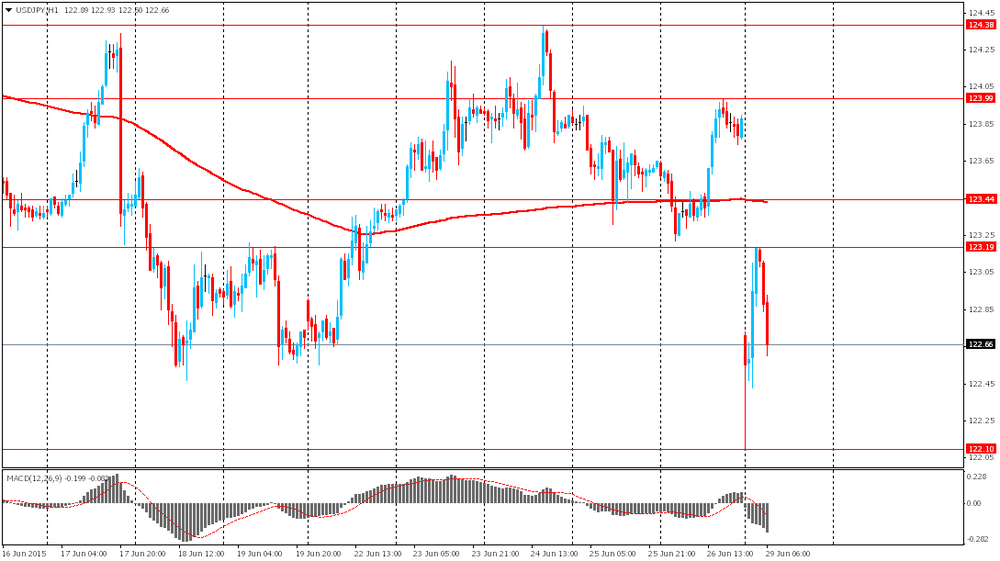 Иена выросла на фоне резкого спроса на валюту-убежище в связи с греческим кризисом. Небольшое давление на японскую валюту оказала публикация слабых данных по промпроизводству. По предварительным данным Министерства экономики, торговли и промышленности Японии, объем промышленного производства в мае снизился с предыдущего значения 1.2% до -2.2%. В годовом исчислении показатель снизился с 1.0% до -4.0%. Данный показатель привлекает к себе повышенное внимание, поскольку является основным индикатором силы и здоровья сектора обрабатывающей промышленности.