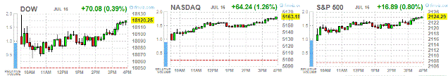 Основные фондовые индексы Уолл-стрит выросли в четверг, а Nasdaq Composite коснулся трехнедельного максимума, на фоне хороших результатов квартальных отчетов таких компаний, как Citigroup (C), eBay (EBAY) и Netflix (NFLX). Netflix выросла на 17,94% до рекордного уровня в $115,73, на следующий день после того как компания сообщила о том, что добавила почти на треть больше абонентов, чем ожидалось во втором квартале.