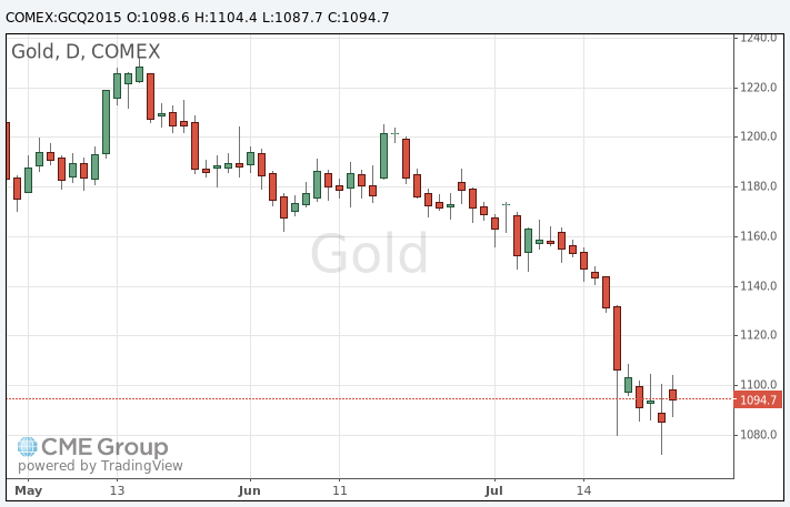 Стоимость августовского фьючерса на золото на COMEX сегодня упала до 1087.70 долларов за унцию.