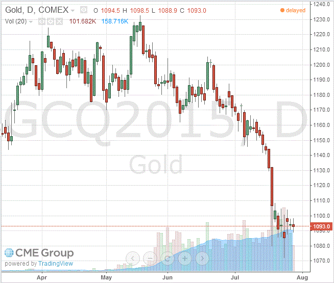 Стоимость августовского фьючерса на золото на COMEX сегодня упала на $3,2 до 1093.00 долларов за унцию.