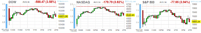 Американские фондовые индексы отступили от минимума сессии, но завершили торги со значительным понижением. Напомним, в начале сегодняшних торгов фьючерсы открылись небывало низко, что было связано с опасениями касательно замедления роста в Китае. Промышленный индекс Доу-Джонса, кратковременно упал более чем на 1000 пунктов, что является самым большим абсолютным падением за всю историю индекса. Сегодня китайский индекс Shanghai Composite рухнул на 7,8%, что является максимальным падением с 2007 года, полностью нивелировав подъем с начала этого года. Неблагоприятные экономические данные, а также сигналы оттока капитала из страны, подорвали беспрецедентные правительственные меры по поддержке фондового рынка КНР.