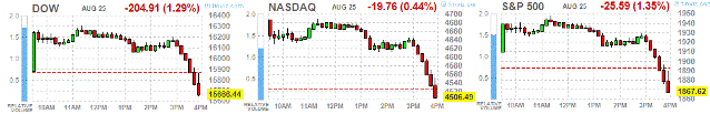 Основные фондовые индексы США снизились во вторник, растеряв при этом все ранее заработанные позиции и продолжив вчерашнее падение, которые было наибольшим за четыре года. В начале сессии поддержку рынку оказали новости о снижении Народным банком Китая (НБК) основных процентных ставок и нормативов резервных требований для банков. однако, к моменту завершения торгов оптимизм угас. Ранее стало известно, что китайский ЦБ уменьшил стоимость кредитования в пятый раз с ноября 2014 года. Ставка по годовым кредитам снижена на 25 базисных пунктов до 4,6%, по годовым депозитам - также на 25 базисных пунктов до 1,75%. Изменения вступят в силу с 26 августа. Нормы резервирования уменьшены на 50 базисных пунктов, решение вступит в силу с 6 сентября. Эти нормативы в 2015 году понижались уже дважды. Таким образом, НБК усилил поддержку экономики на фоне замедления роста и обвала финансовых рынков.