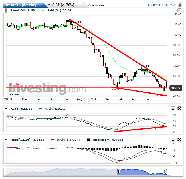 Однако если говорить о технической картине нефти, то пока смесь марки Brent остается торговаться под уровнем сопротивления годовалого нисходящего тренда, а точнее начатого в июне 2014 года, то есть ниже зоны 55-56$ за баррель, игра на повышение может быть только локальной. Для сорта WTI таким сопротивлением выступает район 52,5-53,5$ за баррель.