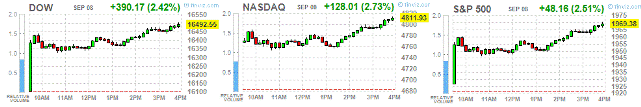 Основные фондовые индексы США значительно выросли сегодня, чему способствовало восстановление аппетита к риску по всему миру и надежды на увеличение мер стимулирования со стороны китайского правительства. Напомним, в понедельник биржи США были закрыты в связи с государственным праздником. Прошлую неделю Standard & Poor's 500 завершил вторым по величине падением в этом году.