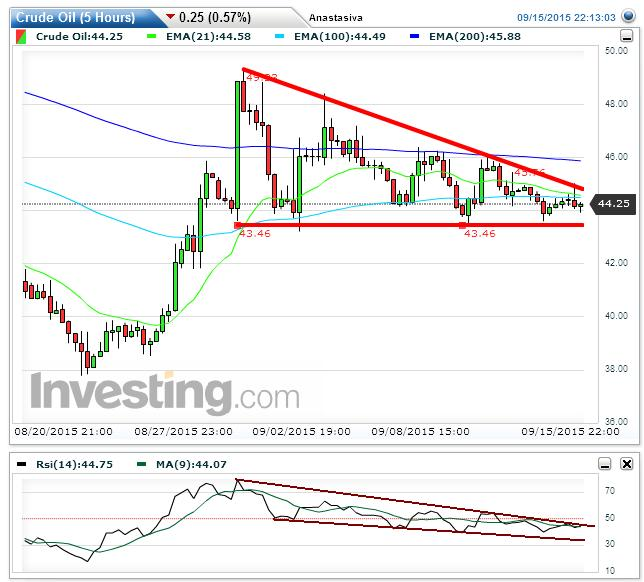 Что касается технической картины нефти, то сейчас на дневных и четырехчасовых масштабах нефти марок Brent и WTI четко видны «треугольники», которые, на мой взгляд, выступят в роли фигур продолжения. Для реализации позитивного сценария смесь марки Brent должна пробить сопротивление, расположенное в зоне 48,5-49$ за баррель, а сорт WTI взять рубеж в 45$ за баррель. В этом случае игроки на повышение могут рассчитывать на подъем цен до зон 54-54,5$ и 50$ за баррель сортов Brent и WTI.