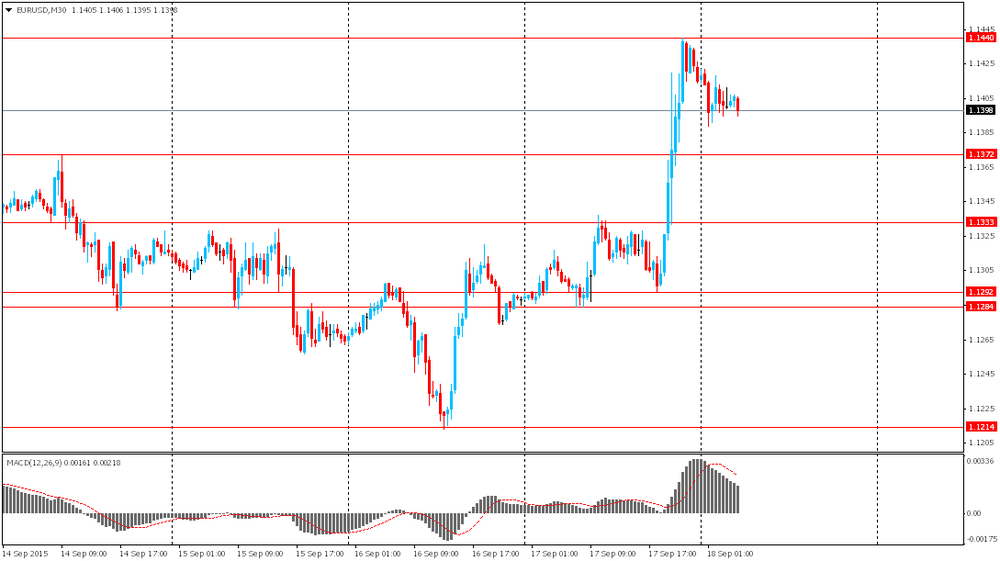 Евро немного снизился против доллара США, корректируясь после вчерашнего стремительного роста вызванного решением Комитета по открытым рынкам. ФРС США оставила краткосрочные процентные ставки без изменений после нескольких недель дебатов. Более низкие ставки в течение более длительного времени являются негативным фактором для доллара, так как они делают валюту менее привлекательными для инвесторов. Большинство трейдеров ожидали, что ФРС не изменит ставки и оставит денежно-кредитную политику без изменений. Тем не менее, заявление ФРС был более голубиным, чем многие игроки рынка ожидали. Доллар подешевел также на фоне неожиданно "мягком" заявлении главы ФРС США Джанет Йеллен относительно намерений регулятора начать цикл повышения процентных ставок. Так, в ходе пресс-конференции по итогам сентябрьского заседания ФРС Йеллен заявила, что более жесткие финансовые условия могут ограничить рост американской экономики. Йеллен также отметила, что уровень безработицы может не полностью отражать слабость рынка труда США, однако заметила, что ситуация на рынке труда США улучшилась.