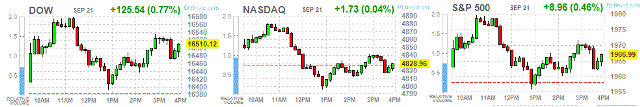 Основные фондовые индексы США умеренно выросли в понедельник, оправившись после больших потерь на прошлой неделе. Последняя волна продаж на глобальных рынках была спровоцирована на прошлой неделе решением Федеральной резервной системы оставить процентные ставки на прежних уровнях. Хотя предельно низкие процентные ставки способствуют росту фондовых рынков на протяжении уже многих лет после финансового кризиса, нежелание ФРС повышать стоимость заимствований стало напоминанием о хрупком положении мировой экономики и ее уязвимости перед замедлением в Китае.