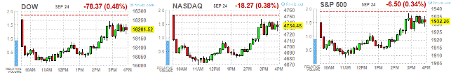 Основные фондовые индексы США потеряли менее 0,5 процента. Основное давление оказали акции компании Caterpillar (CAT), которые обвалились после снижения прогноза продаж, а также усугубление опасений по поводу замедления глобального экономического роста.