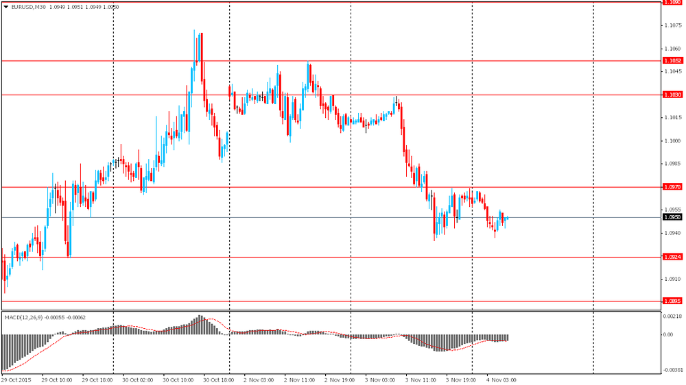 Евро снижался в ожидании дальнейших мер стимулирования экономики и инфляции со стороны ЕЦБ. Вместе с этим растут ожидания повышения учетной ставки ФРС в декабре. Многие эксперты отмечают, дальнейший рост евро остается ограниченным. По мнению главного экономиста Berenberg Хольгера Шмидинга, учитывая текущий темп инфляции, вероятность дальнейшего смягчения денежно-кредитной политики ЕЦБ в декабре составляет 60%. Данные ожидания также подтверждают последние заявления главы ЕЦБ Драги. Он отметил, что ЦБ готов сделать все возможное, чтобы удерживать среднесрочные цели по инфляции. "Если мы увидим, что наш среднесрочный целевой инфляционный показатель подвергается рискам, мы предпримем все необходимые действия. Если нужно, мы запустим новые стимулы" - отметил Драги. Также банкир заявил, что инфляция будет оставаться вблизи нулевого уровня, или даже на отрицательной стороне, как минимум до начала следующего года.