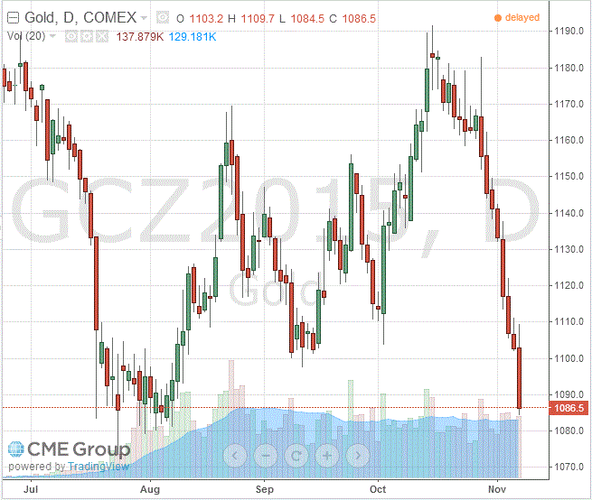 Стоимость декабрьского фьючерса на золото на COMEX сегодня упала до 1086.50 долларов за унцию.