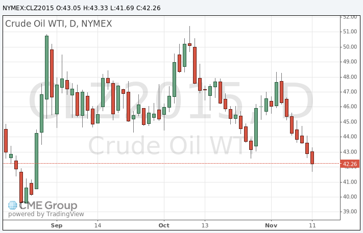 Стоимость декабрьских фьючерсов на американскую легкую нефть марки WTI (Light Sweet Crude Oil) упала до 41,69 доллара за баррель на Нью-Йоркской товарной бирже.