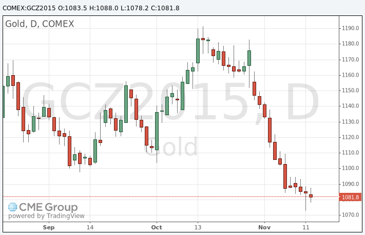 Стоимость декабрьского фьючерса на золото на COMEX сегодня упала до 1078.20 долларов за унцию.
