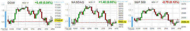 Основные американские фондовые индексы закрылись преимущественно в плюсе на фоне сильных корпоративных отчетов, в частности компаний Wal-Mart (WMT) и Home Depot (HD). Стоит отметить, что потребительские цены в США выросли в октябре, хотя более широкая тенденция свидетельствует, что базовая инфляция остается исторически слабой. Индекс потребительских цен, который измеряет то, что американцы платят за все, от медицинских услуг до продуктов питания, вырос с учетом сезонных колебаний на 0,2%, после двух месяцев снижения. За исключением продовольствия и энергоносителей, так цены выросли на 0,2%, так же, как и в сентябре.