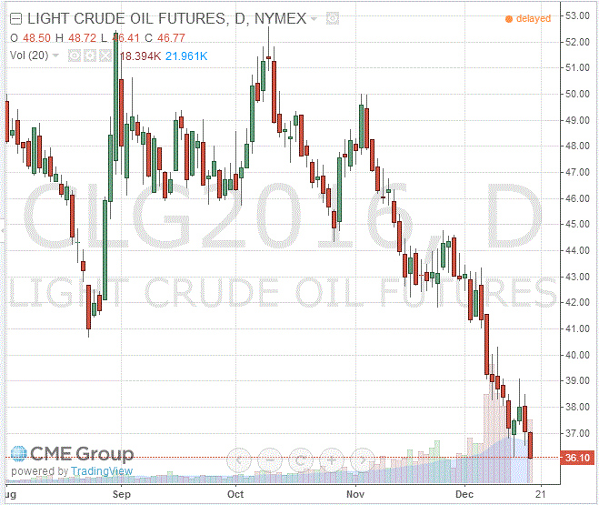 Стоимость февральских на американскую легкую нефть марки WTI (Light Sweet Crude Oil) упала до 36,10 доллара за баррель на Нью-Йоркской товарной бирже.