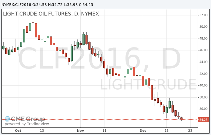В пятницу фьючерсы на нефть WTI на Нью-Йоркской товарной бирже (Nymex) рухнули до $34,29, минимума с февраля 2009 года, после того, как данные показали рост числа буровых установок в США на прошлой неделе, усиливая обеспокоенность по поводу повышенного уровня национального производства.
