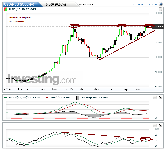 Курс американского доллара по-прежнему находится вблизи опасных рубежей. Главная опасность, на мой взгляд, заключается в том, что если вы сейчас откроете недельный график валютной пары USDRUR, то увидите, что она в третий раз приближается к сопротивлению в зоне 71,5-72 рублей. Заброс от декабря 2014 года, где оставлена лишь «тень» свечи не в счет. Плюс амплитуда колебаний приняла форму восходящего «треугольника», и поверьте, как бы мне хотелось, чтобы это был восходящий «клин».