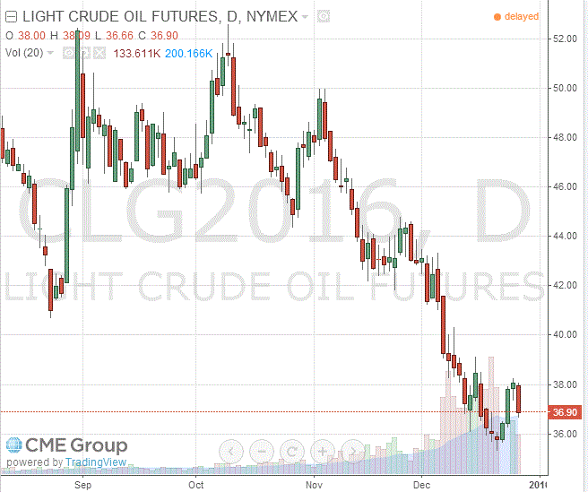 Стоимость февральских фьючерсов на американскую легкую нефть марки WTI (Light Sweet Crude Oil) упала до 36,90 доллара за баррель на Нью-Йоркской товарной бирже.