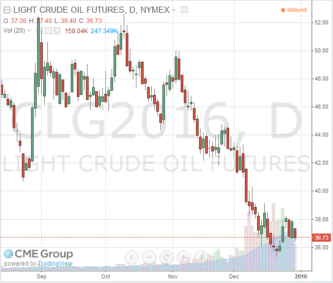 Стоимость февральских фьючерсов на американскую легкую нефть марки WTI (Light Sweet Crude Oil) упала до 36,73 доллара за баррель на Нью-Йоркской товарной бирже.