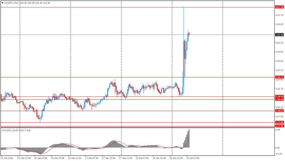 Иена обвалилась после решение Банка Японии ввести отрицательные ставки по депозитам. Отрицательная ставка введена в Японии впервые в истории. За это решение проголосовали пять из девяти членов правления. Центральный банк оставил объем программы покупки активов на уровне 80 трлн иен (673 млрд долларов США) в год. За это решение проголосовали восемь из девяти членов правления. В своем выступление после заседания глава Банка Японии, Курода заявил, что негативные процентные ставки помогут достичь целевой уровень инфляции 2%. Также управляющий ЦБ отметил, о готовности и далее корректировать монетарную политику и уровень отрицательных ставок при возникновении необходимости. При этом, банкир предупредил инвесторов, что введение отрицательных ставок по депозитам вовсе не означает, что объем программы количественного смягчения не может быть расширен. Курода по-прежнему ждет ускорения роста инфляции к 2%.