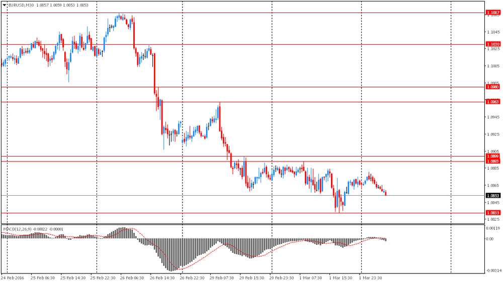 Евро торговалось без значительных изменений в ожидании заседания ЕЦБ на следующей неделе. Сегодня в письме члену Европарламента Марио Драги пообещал на заседание 9-10 марта заново проанализировать и, возможно, пересмотреть свою программу стимулирования, общий объем которой сейчас составляет примерно 1,5 трлн евро (1,6 трлн долларов США). Изменений возможны, т.к. выросли экономические риски и инфляция оказалась более слабой, чем ожидалось.