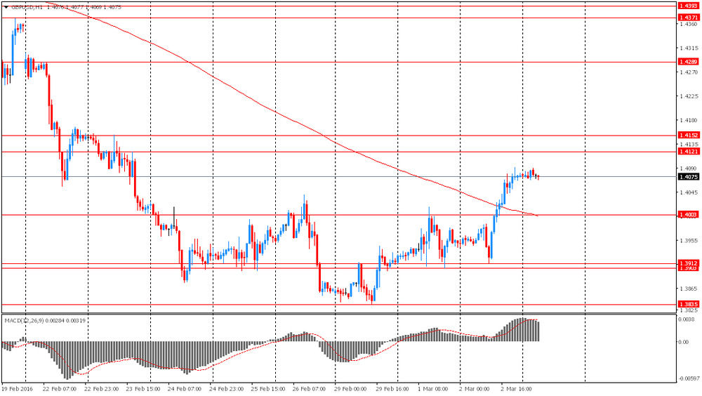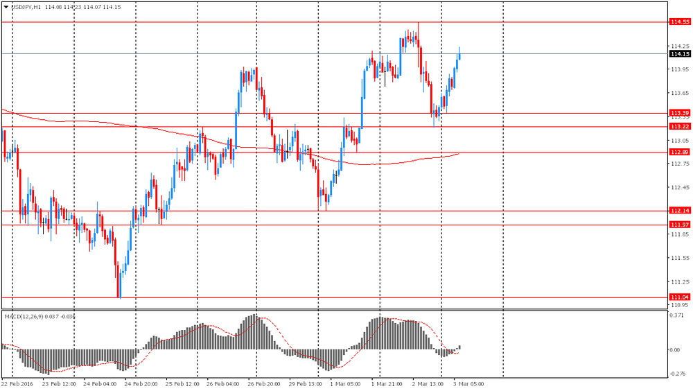 Иена упала против всех основных валют на фоне улучшения экономических данных из США и восстановления цен на нефть. Эти новости снизили спрос на валюту-убежище и курс японской иены подошел к своему двухнедельному минимуму против доллара США. Согласно Бежевой книге, опубликованной вчера, в большинстве округов США в период с начала января по 22 февраля был отмечен рост экономической активности и потребительских расходов, а также улучшение ситуации на рынке труда и в жилищном секторе. Несмотря на то, что экономический рост был отмечен в меньшем числе округов по сравнению с предыдущей Бежевой книгой, представители компаний, опрошенные в рамках составления отчета, были, в целом, оптимистично настроены в отношении будущих перспектив экономики. Позитивные данные приводят к росту ожиданий относительно повышения процентных ставок Федеральной резервной системы в текущем году.